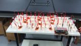 写真のようにモーターと豆電球をつなぎます。豆電球は、発電したことを確かめるためのものです。