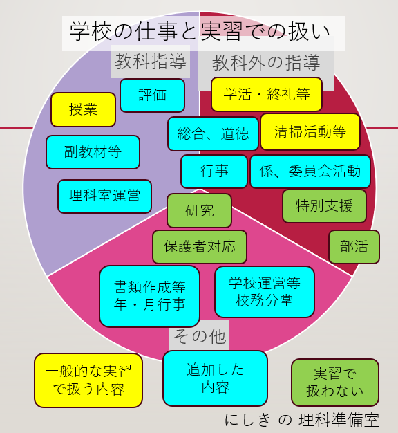 学校の仕事と教育実習での扱いについて、ざっくりまとめたものが上の表です。これら以外の仕事もあるかと思いますが、主だったものはこのようなところです。